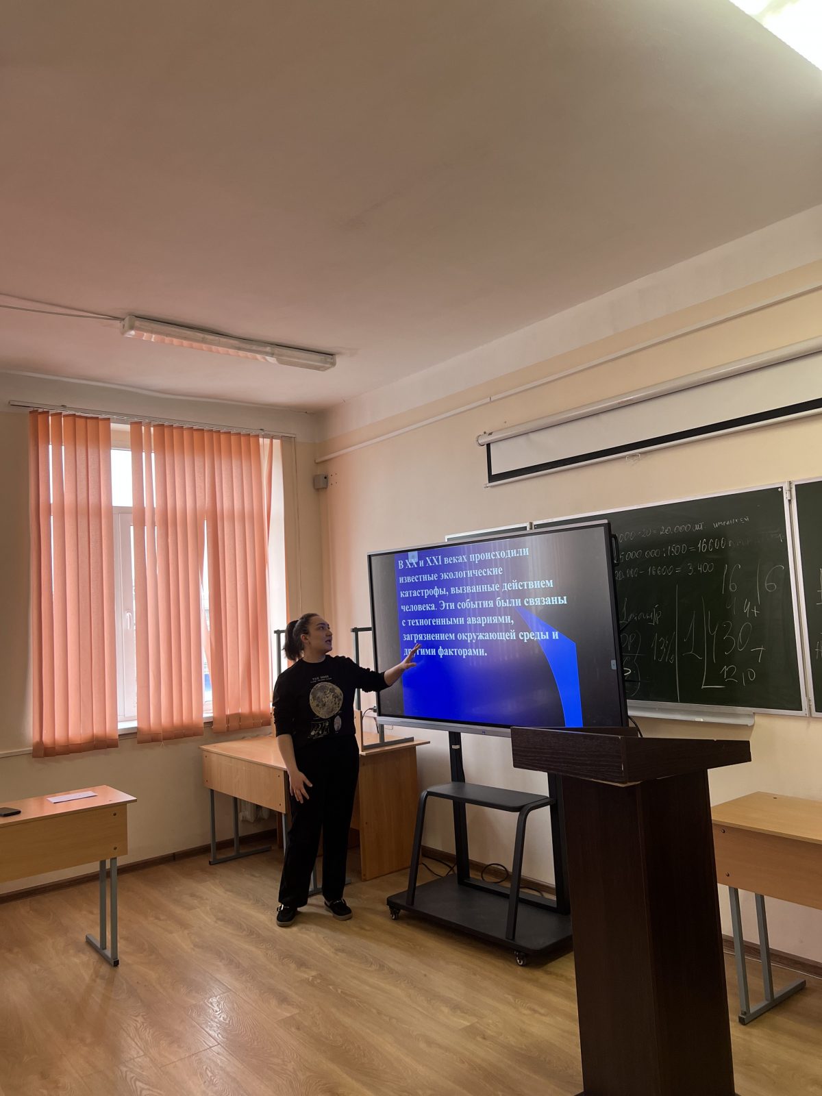 С презентацией об экологических катастрофах, вызванные действием человека, выступила ст – ка 2к. Табаксоева Сабина. О глобальных мерах, предпринимаемых в мире для улучшения экологической обстановки, рассказала участникам ст -ка 1 к. Нагоева Элина.